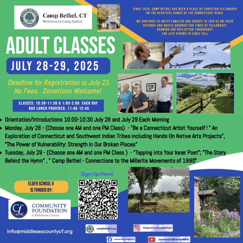 Camp Bethel would like to thank the Community Foundation of Middlesex County for their generous support in putting on Elder School here at Camp! We appreciate the CFMC helping us keep our piece of history alive while sharing other local historical and geological presentations with the surrounding communities. Find the Community Foundation of Middlesex County
